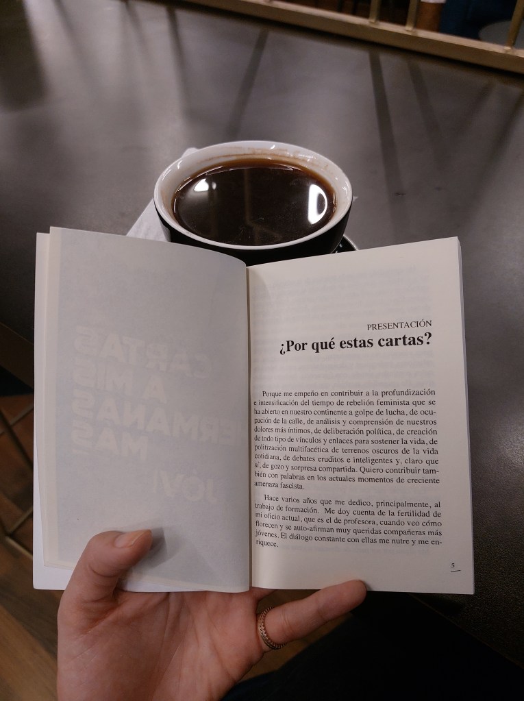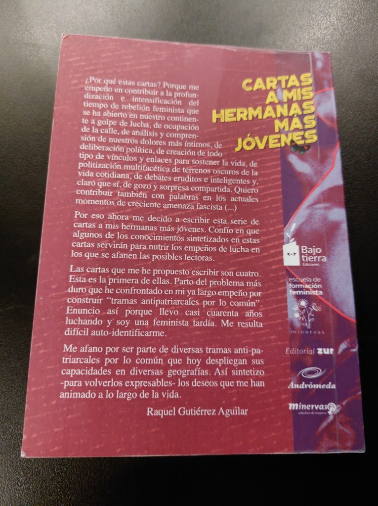 Si estás en la introspección y búsqueda de formar tus propios conceptos y posturas feministas o simplemente tienes la genuina curiosidad de comprender por qué existe el feminismo y/o de qué se trata, Cartas a mis hermanas más jóvenes de Raquel Gutiérrez Aguilar sería una gran aportación, sobre todo, porque escribe desde un feminismo latinoamericano del siglo XXI, específicamente mexicano.